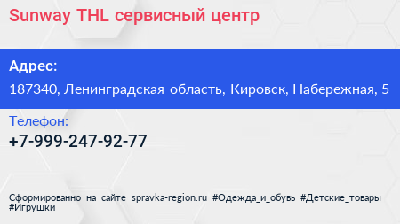 Sunway-THL, сервисный центр по адресу 187340, Ленинградская область, Кировск, Набережная, 5 в дальнейшем Организация, размещена в следующих категориях: