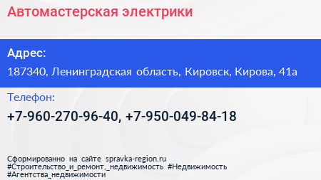 Автомастерская электрики по адресу 187340, Ленинградская область, Кировск, Кирова, 41а в дальнейшем Организация, размещена в следующих категориях: