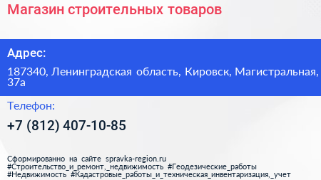 Магазин строительных товаров по адресу 187340, Ленинградская область, Кировск, Магистральная, 37а в дальнейшем Организация, размещена в следующих категориях: