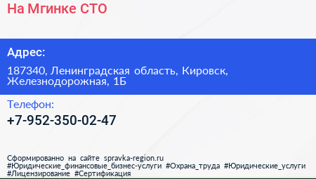 На Мгинке, СТО по адресу 187340, Ленинградская область, Кировск, Железнодорожная, 1Б в дальнейшем Организация, размещена в следующих категориях: