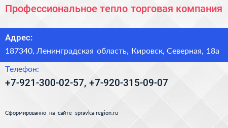 Профессиональное тепло, торговая компания по адресу 187340, Ленинградская область, Кировск, Северная, 18а в дальнейшем Организация, размещена в следующих категориях: