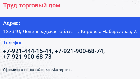 Труд, торговый дом по адресу 187340, Ленинградская область, Кировск, Набережная, 7а в дальнейшем Организация, размещена в следующих категориях: