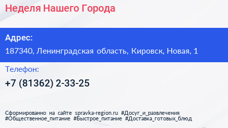 Неделя Нашего Города по адресу 187340, Ленинградская область, Кировск, Новая, 1 в дальнейшем Организация, размещена в следующих категориях: