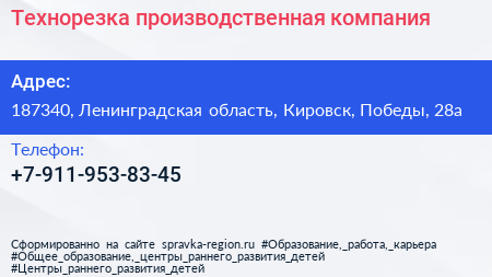 Технорезка, производственная компания по адресу 187340, Ленинградская область, Кировск, Победы, 28а в дальнейшем Организация, размещена в следующих категориях: