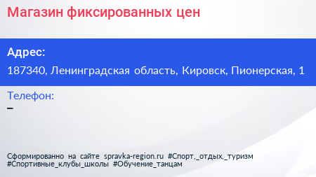 Магазин фиксированных цен по адресу 187340, Ленинградская область, Кировск, Пионерская, 1 в дальнейшем Организация, размещена в следующих категориях: