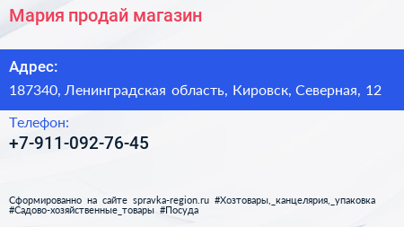 Мария продай, магазин по адресу 187340, Ленинградская область, Кировск, Северная, 12 в дальнейшем Организация, размещена в следующих категориях: