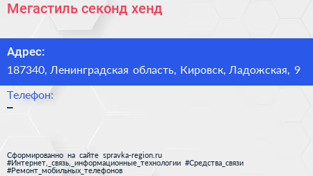 Мегастиль, секонд-хенд по адресу 187340, Ленинградская область, Кировск, Ладожская, 9 в дальнейшем Организация, размещена в следующих категориях: