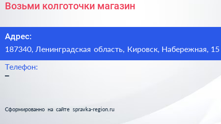 Возьми колготочки, магазин по адресу 187340, Ленинградская область, Кировск, Набережная, 15 в дальнейшем Организация, размещена в следующих категориях: