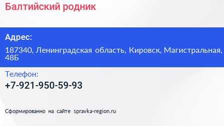 Балтийский родник по адресу 187340, Ленинградская область, Кировск, Магистральная, 48Б в дальнейшем Организация, размещена в следующих категориях: