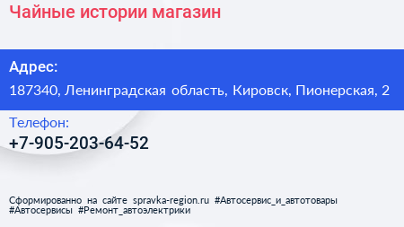 Чайные истории, магазин по адресу 187340, Ленинградская область, Кировск, Пионерская, 2 в дальнейшем Организация, размещена в следующих категориях: