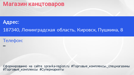 Магазин канцтоваров по адресу 187340, Ленинградская область, Кировск, Пушкина, 8 в дальнейшем Организация, размещена в следующих категориях: