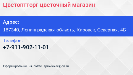 Цветоптторг, цветочный магазин по адресу 187340, Ленинградская область, Кировск, Северная, 4Б в дальнейшем Организация, размещена в следующих категориях: