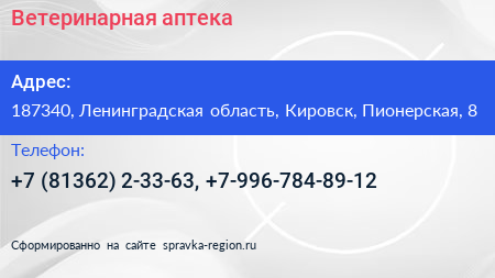 Ветеринарная аптека по адресу 187340, Ленинградская область, Кировск, Пионерская, 8 в дальнейшем Организация, размещена в следующих категориях:
