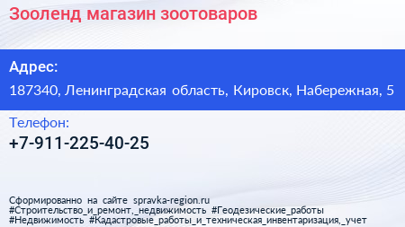 Зооленд, магазин зоотоваров по адресу 187340, Ленинградская область, Кировск, Набережная, 5 в дальнейшем Организация, размещена в следующих категориях: