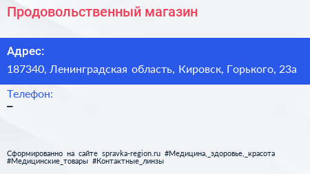 Продовольственный магазин по адресу 187340, Ленинградская область, Кировск, Горького, 23а в дальнейшем Организация, размещена в следующих категориях: