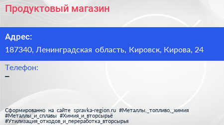 Продуктовый магазин по адресу 187340, Ленинградская область, Кировск, Кирова, 24 в дальнейшем Организация, размещена в следующих категориях: