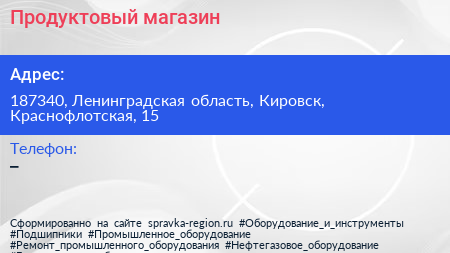 Продуктовый магазин по адресу 187340, Ленинградская область, Кировск, Краснофлотская, 15 в дальнейшем Организация, размещена в следующих категориях:
