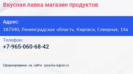 Вкусная лавка, магазин продуктов по адресу 187340, Ленинградская область, Кировск, Северная, 14а в дальнейшем Организация, размещена в следующих категориях: