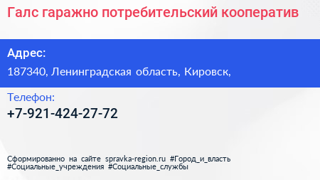 Галс, гаражно-потребительский кооператив по адресу 187340, Ленинградская область, Кировск, в дальнейшем Организация, размещена в следующих категориях: