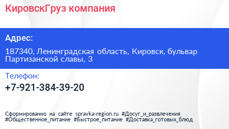 КировскГруз, компания по адресу 187340, Ленинградская область, Кировск, бульвар Партизанской славы, 3 в дальнейшем Организация, размещена в следующих категориях: