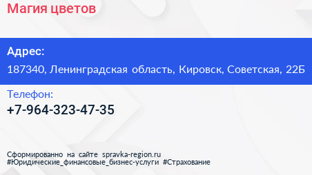 Магия цветов по адресу 187340, Ленинградская область, Кировск, Советская, 22Б в дальнейшем Организация, размещена в следующих категориях: