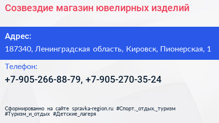 Созвездие, магазин ювелирных изделий по адресу 187340, Ленинградская область, Кировск, Пионерская, 1 в дальнейшем Организация, размещена в следующих категориях: