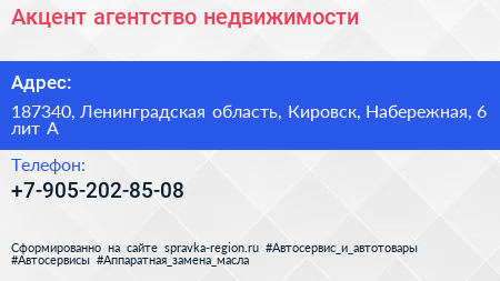 Акцент, агентство недвижимости по адресу 187340, Ленинградская область, Кировск, Набережная, 6 лит А в дальнейшем Организация, размещена в следующих категориях: