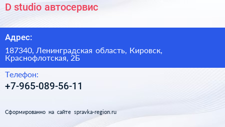 D`studio, автосервис по адресу 187340, Ленинградская область, Кировск, Краснофлотская, 2Б в дальнейшем Организация, размещена в следующих категориях: