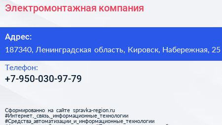 Электромонтажная компания по адресу 187340, Ленинградская область, Кировск, Набережная, 25 в дальнейшем Организация, размещена в следующих категориях: