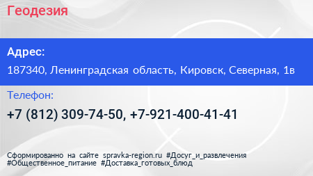 Геодезия по адресу 187340, Ленинградская область, Кировск, Северная, 1в в дальнейшем Организация, размещена в следующих категориях:
