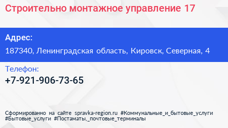 Строительно-монтажное управление 17 по адресу 187340, Ленинградская область, Кировск, Северная, 4 в дальнейшем Организация, размещена в следующих категориях: