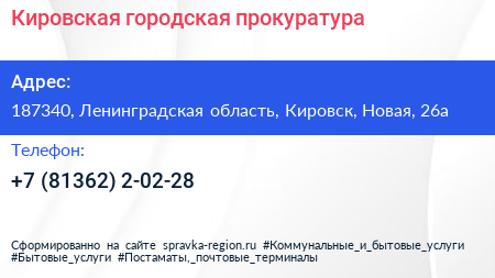 Кировская городская прокуратура по адресу 187340, Ленинградская область, Кировск, Новая, 26а в дальнейшем Организация, размещена в следующих категориях: