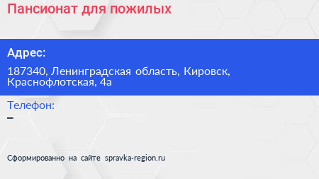 Пансионат для пожилых по адресу 187340, Ленинградская область, Кировск, Краснофлотская, 4а в дальнейшем Организация, размещена в следующих категориях: