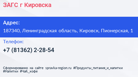 ЗАГС г. Кировска по адресу 187340, Ленинградская область, Кировск, Пионерская, 1 в дальнейшем Организация, размещена в следующих категориях: