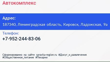 Автокомплекс по адресу 187340, Ленинградская область, Кировск, Ладожская, 9а в дальнейшем Организация, размещена в следующих категориях: