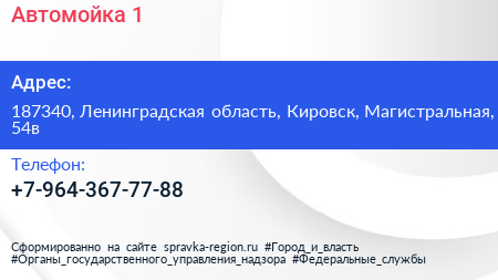 Автомойка №1 по адресу 187340, Ленинградская область, Кировск, Магистральная, 54в в дальнейшем Организация, размещена в следующих категориях:
