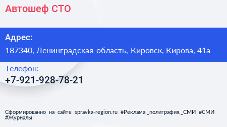 Автошеф, СТО по адресу 187340, Ленинградская область, Кировск, Кирова, 41а в дальнейшем Организация, размещена в следующих категориях: