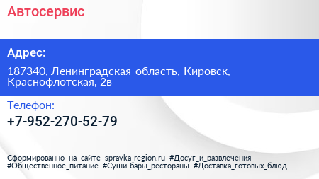 Автосервис по адресу 187340, Ленинградская область, Кировск, Краснофлотская, 2в в дальнейшем Организация, размещена в следующих категориях:
