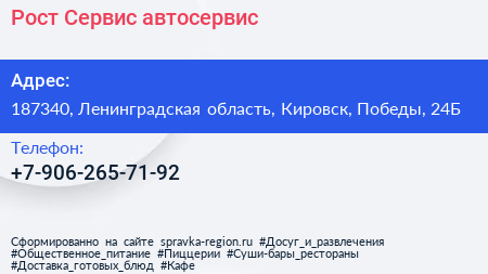 Рост-Сервис, автосервис по адресу 187340, Ленинградская область, Кировск, Победы, 24Б в дальнейшем Организация, размещена в следующих категориях: