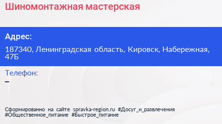 Шиномонтажная мастерская по адресу 187340, Ленинградская область, Кировск, Набережная, 47Б в дальнейшем Организация, размещена в следующих категориях: