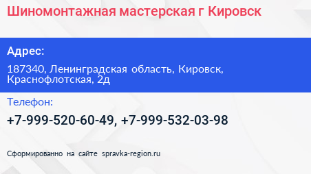 Шиномонтажная мастерская, г. Кировск по адресу 187340, Ленинградская область, Кировск, Краснофлотская, 2д в дальнейшем Организация, размещена в следующих категориях: