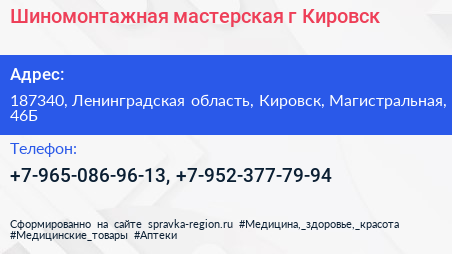 Шиномонтажная мастерская, г. Кировск по адресу 187340, Ленинградская область, Кировск, Магистральная, 46Б в дальнейшем Организация, размещена в следующих категориях: