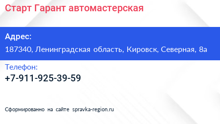 Старт-Гарант, автомастерская по адресу 187340, Ленинградская область, Кировск, Северная, 8а в дальнейшем Организация, размещена в следующих категориях: