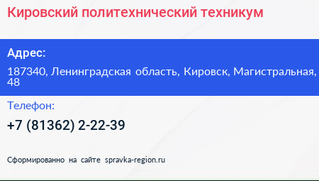 Кировский политехнический техникум по адресу 187340, Ленинградская область, Кировск, Магистральная, 48 в дальнейшем Организация, размещена в следующих категориях: