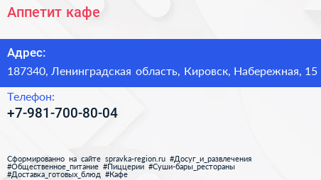 Аппетит, кафе по адресу 187340, Ленинградская область, Кировск, Набережная, 15 в дальнейшем Организация, размещена в следующих категориях: