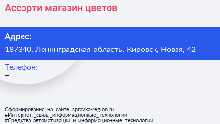 Ассорти, магазин цветов по адресу 187340, Ленинградская область, Кировск, Новая, 42 в дальнейшем Организация, размещена в следующих категориях: