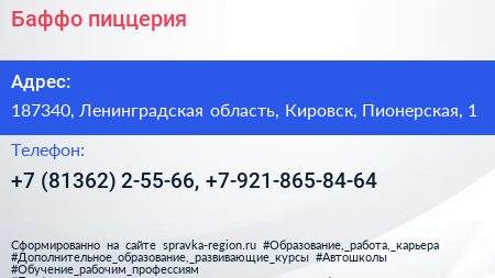 Баффо, пиццерия по адресу 187340, Ленинградская область, Кировск, Пионерская, 1 в дальнейшем Организация, размещена в следующих категориях: