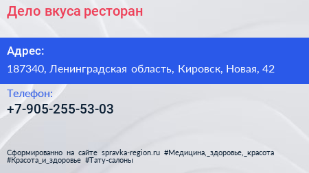 Дело вкуса, ресторан по адресу 187340, Ленинградская область, Кировск, Новая, 42 в дальнейшем Организация, размещена в следующих категориях: