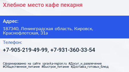Хлебное место, кафе-пекарня по адресу 187340, Ленинградская область, Кировск, Краснофлотская, 31а в дальнейшем Организация, размещена в следующих категориях: