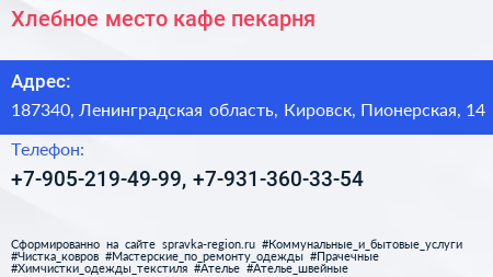 Хлебное место, кафе-пекарня по адресу 187340, Ленинградская область, Кировск, Пионерская, 14 в дальнейшем Организация, размещена в следующих категориях: